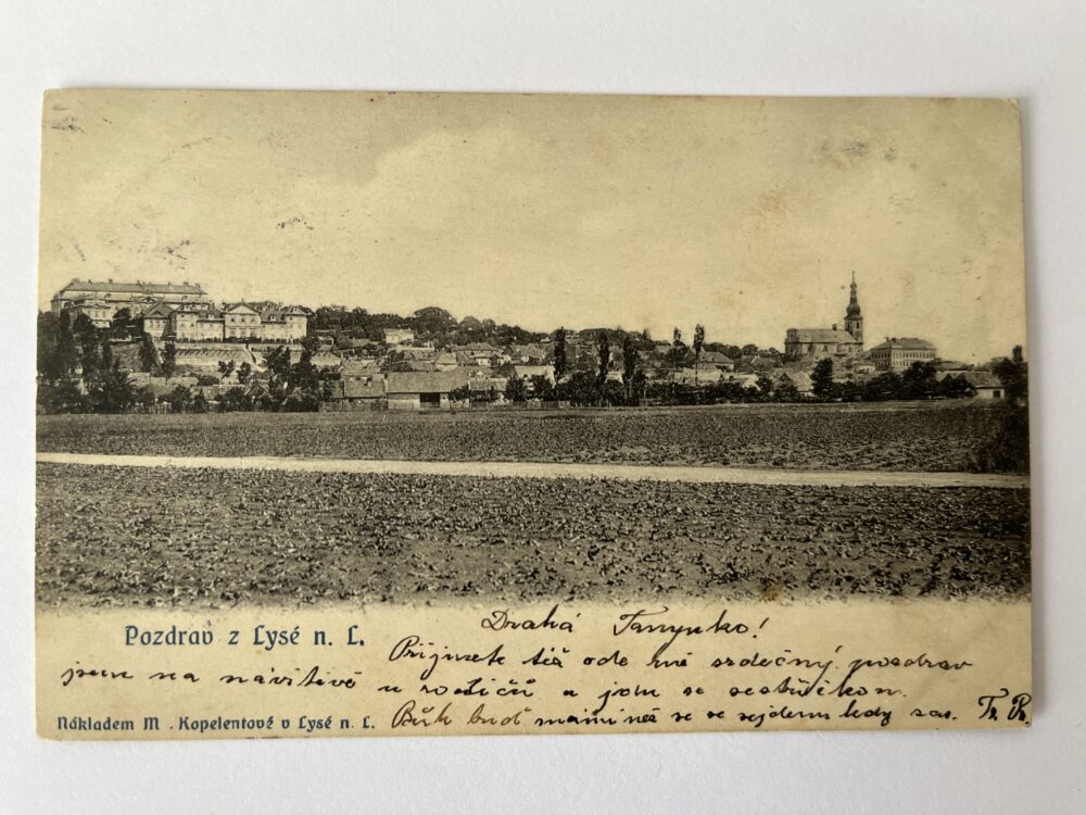 SoldPohlednice místopis Bezno, koláž zámek, škola okr. Mladá Boleslav 1943