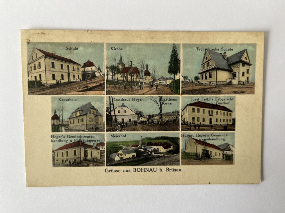 Pohlednice Banín – kostel, škola, obchod, hostinec koláž okres Svitavy