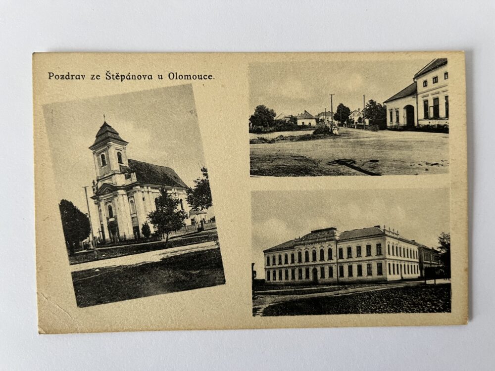 Pohlednice místopis ŠTĚPÁNOV u Olomouce, kostel, škola koláž 1921
